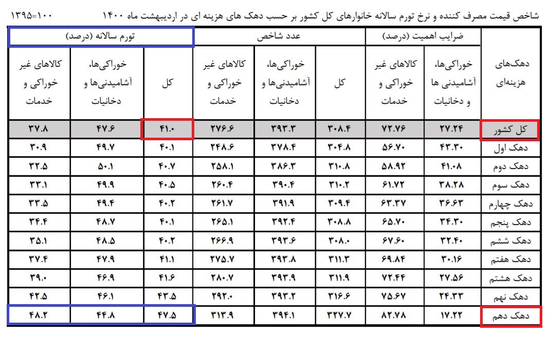 همچنین در دهک هزینه ای دهم در حالی با بیشترین نرخ تورم سالانه در سطح ۴۷.۵ درصد مواجه هستیم که نرخ تورم سالانه در بخش خوراکی ها و آشامیدنی های این دهک به رقم ۴۴.۸ درصد و در بخش کالاهای غیرخوراکی و خدمات به رقم ۴۸.۲ درصد رسیده است.