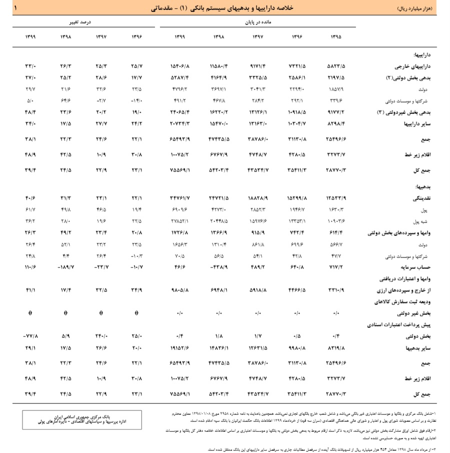 همچنین میزان دارایی های خارجی سیستم بانکی در ادامه روند رشد سال های اخیر با ۳۳ درصد رشد در پایان سال گذشته به رقم بیش از ۱۵ هزار و ۴۰۶ هزار میلیارد رسید و رقم بدهی بخش دولتی نیز با ۲۷ درصد رشد به میزان بیش از ۵ هزار و ۲۸۷ هزار میلیارد ریال بالغ شد.