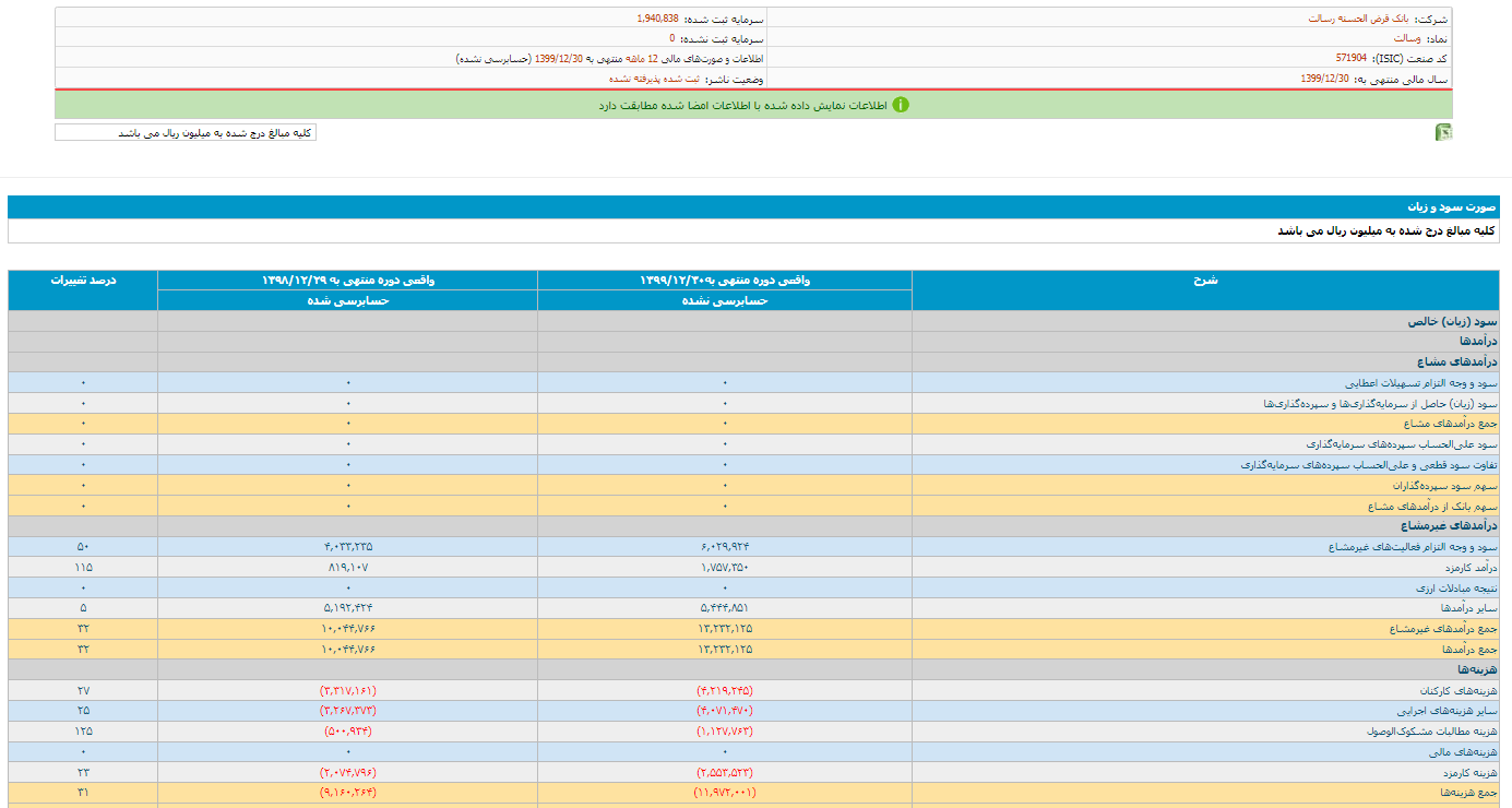 به گزارش ایبِنا، بررسی اطلاعات و صورتهای مالی تلفیقی دوازده ماهه منتهی به ۱۳۹۹/۱۲/۳۰ (حسابرسی نشده) بانک قرض الحسنه رسالت نشان می دهد در بخش گردش حساب سود (زیان) انباشته این بانک، میزان سود خالص با رشد ۵۱ درصدی نسبت به دوره منتهی به ۱۳۹۸/۱۲/۲۹ به رقم ۱,۲۶۰,۱۲۴ میلیون ریال رسیده است. همچنین در این بخش از صورت های مالی بانک قرض الحسنه رسالت، میزان سرمایه در دوره منتهی به ۱۳۹۹/۱۲/۳۰ به رقم ۱,۹۴۰,۸۳۸ میلیون ریال رسیده است.