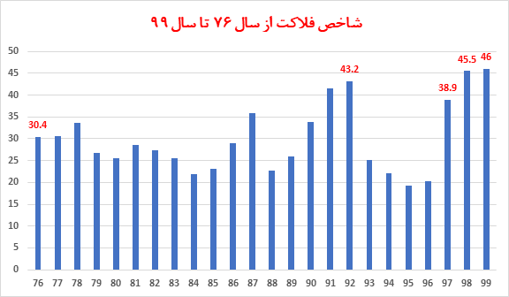 نمودار زیر شاخص فلاکت را از سال ۱۳۷۶ تا تابستان ۱۳۹۹ را نشان میدهد. برای محاسبه شاخص فلاکت از دادههای نرخ بیکاری و نرخ تورم مرکز آمار ایران استفاده شده است. همانگونه که در نمودار زیر میبینید، شاخص فلاکت در سال ۹۲ و همزمان با در اختیار گرفتن سکان هدایت قوه مجریه توسط دولت تدبیر و امید حدود ۴۳.۲ درصد بوده است. این شاخص حالا و در پایان سال ۱۴۰۰ به ۴۶ درصد رسیده است؛ یعنی با ملاک شاخص فلاکت، رفاه مردم در این سالها علیرغم همه وعدههای داده شده برای رفاه بیشتر کاهش یافته است.