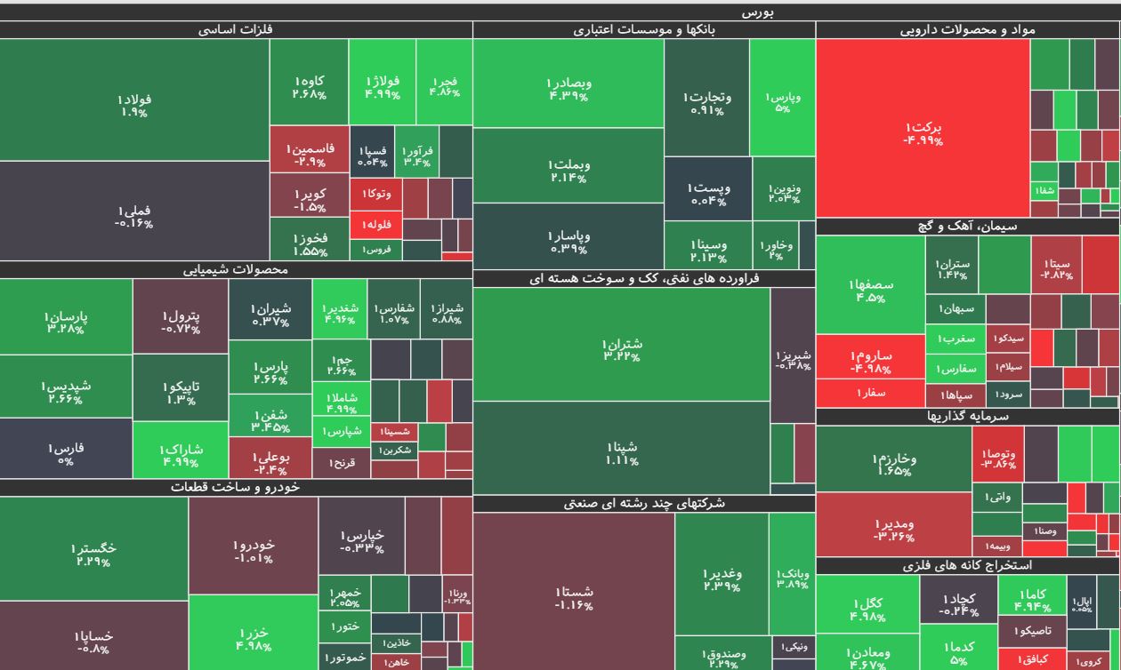 در بازار امروز، بیشترین افزایش قیمت متعلق به نماد کالا(بورس کالای ایران) با ۱۵.۱۶ درصد رشد و پس از آن، نمادهای تکشا، کدما، سفارس، بنیرو و شاملا بود. همچنین نماد معاملاتی وسکرشا(س.سهام عدالت استان کرمانشاه) با ۱۰ درصد، بیشترین کاهش قیمت را داشت و پس از آن نیز، نمادهای قشهد، قلرست، کساپا، سهرمز، ثنوسا و برکت قرار گرفتند.