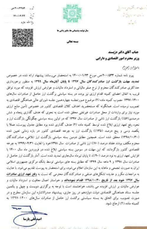 با عنایت به مراجعات مکرر و عدیده تشکل های صنفی و صادرکنندگان محترمی که نسبت به رفع تعهد ارزی صادرات سال ۱۳۹۷ خود بعد از تاریخ ۱۳۹۸.۱۰.۳۰ اقدام نموده اند و خواستار اعمال معافیت و استرداد مالیات و عوارض مالیات بر ارزش افزوده می باشند، خواهشمند است با توجه به برگزاری دویست و چهل و یکمین جلسه شورای هماهنگی اقتصادی دولت دوازدهم، پیشنهاد صدرالاشاره این سازمان مطرح و در صورت تصویب، برای الحاق به بسته سیاستی برگشت ارز حاصل از صادرات سال های ۱۳۹۷-۱۴۰۰ به کمیته ماده (۲) ارجاع شود.