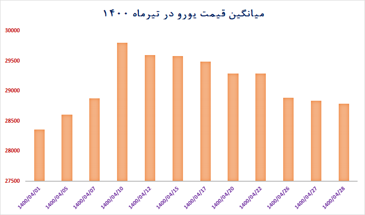 از سوی دیگر، یورو نیز در این مدت با نوسان همراه بود. به گونه ای که میانگین نرخ فروش هر اسکناس یورو در صرافی های بانکی و مجاز سطح کشور با رشد حدود ۹۰۰ تومانی معادل ۳.۲ درصدی مواجه شد. هرچند بر خلاف دلار، در این مدت سرعت رشد نرخ یورو با افزایش بیشتری نسبت به خردادماه (۲.۶ درصد) به ثبت رسیده است.