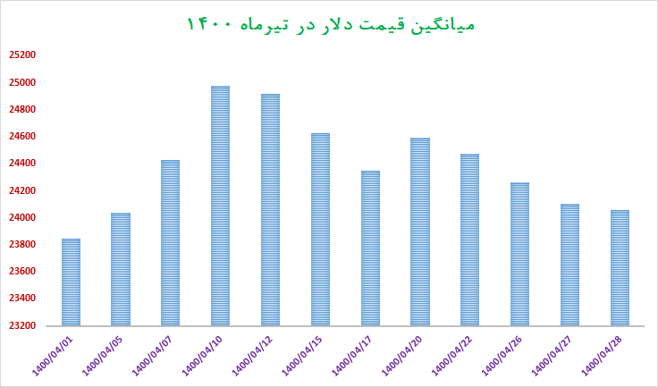 هرچند از ابتدای تیرماه تا آخرین روز کاری این ماه، شاخص ارزی تا مرز ۲۵ هزار تومان در تاریخ دهم تیرماه نیز پیشروی داشت، اما با افزایش عرضه و پاسخ به نیاز متقاضیان واقعی از سوی بازارساز، جو افزایشی در بازار تداوم نداشت و به مرور بازار به ثبات نسبی در کانال بیست و چهار هزار تومانی رسید.