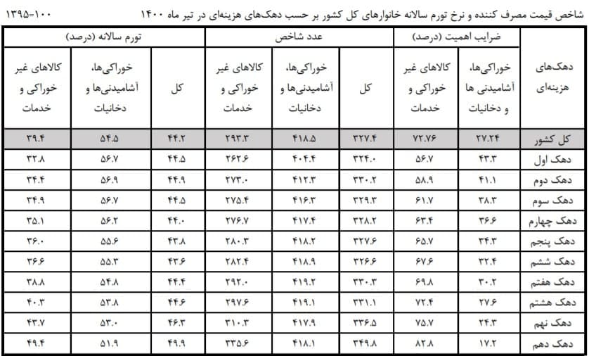 بر اساس این گزارش، در تیرماه ۱۴۰۰، نرخ تورم سالانه کالاهای غیرخوراکی و خدمات ۷۲.۷۶ درصد در کل کشور اعلام شده است. به گونهای که در بخش هزینهها، کمترین نرخ تورم سالانه کالاهای غیرخوراکی برای دهک اول(طبقه فقیر) با ۵۶.۷ درصد و بیشترین نرخ تورم نیز برای دهک دهم (طبقه مرفه) ۸۲.۸ درصد برآورد شده است.