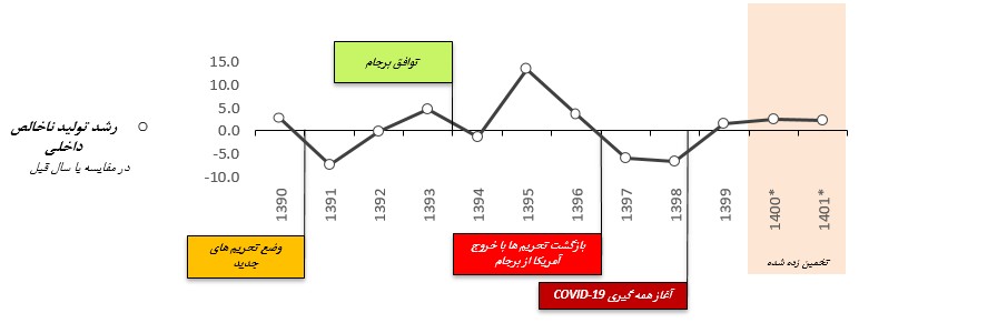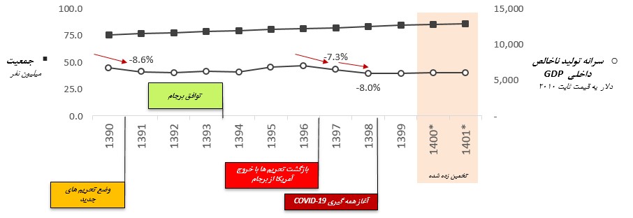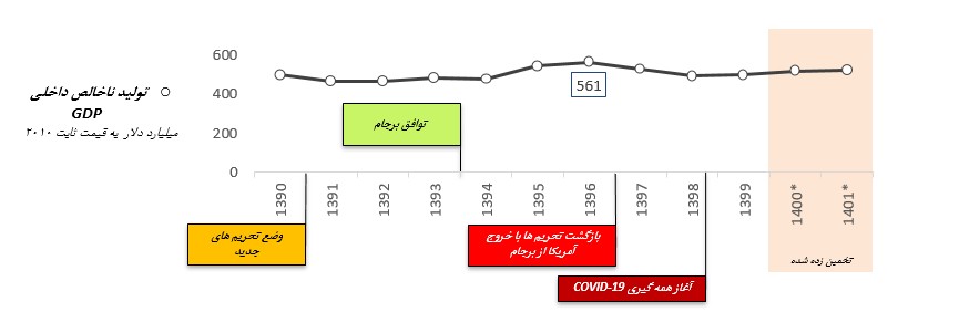 چالش‌های مختلف اقتصادی و اجتماعی باعث کندشدن حرکت چرخ‌های اقتصادی کشور و کاهش تولید ناخالص داخلی شده‌اند. با بازگشت تحریم‌ها از سال ۱۳۹۶، تولید ناخالص داخلی روند کاهشی به خود گرفت و این روند با شروع بحران کرونا و مسائل ناشی از آن مانند بسته‌شدن مرزها، سرعت بیشتری گرفته است.