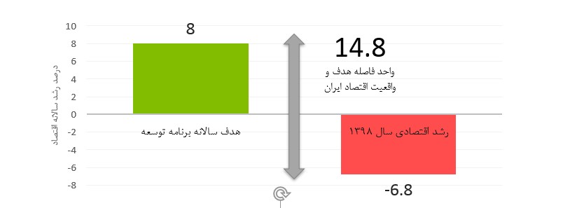 کوچک‌شدن اقتصاد باعث شد ایران از اهداف تعریف‌شده دور بماند. در سند چشم‌انداز ۱۴۰۴، برای تبدیل‌ ایران به قدرت اول اقتصادی منطقه هدف‌گذاری شد؛ برای تحقق این هدف، متوسط رشد اقتصادی سالانه ۸درصد نیاز بود، اما با شروع مجدد تحریم‌ها در سال ۱۳۹۶، رشد واقعی اقتصادی ایران از هدف تعیین‌شده فاصله گرفت. این فاصله در سال ۱۳۹۸ به بالاترین انحراف خود از زمان توافق هسته‌ای ایران (برجام) رسید.