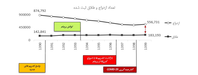آمار طلاق و تولد نیز در وضعیت اقتصادی ایران قابل توجه است. طبق داده‌های سازمان ثبت احوال در سال ۱۳۹۹، در ازای هر ۳ ازدواج، یک طلاق ثبت شده است که در مقایسه با سال ۱۳۹۰ دو برابر شده است. در شرایط حال حاضر آمار تولد نیز روند کاهشی داشته است.