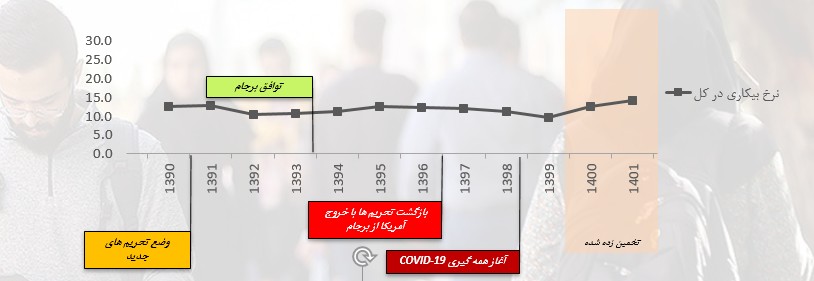 وقتی شرایط اقتصادی از توازن خارج می‌شود، افزایش بیکاری نمود دیگری پیدا می‌کند. طبق گزارش مرکز آمار، نرخ بیکاری در جمعیت بالای ۱۵ سال روند کاهشی دارد. نرخ بیکاری سال ۱۳۹۹ در حدود ۶/۹درصد برآورد شده است. این در حالی است که طبق گزارش مرکز پژوهش‌های مجلس، نرخ واقعی بیکاری در تابستان ۹۹ در حدود ۵/۱۸درصد بوده است؛ بدین ترتیب، نرخ واقعی بیکاری در این دوره بیش از ۲ برابر برآورد مرکز آمار تخمین زده می‌شود.