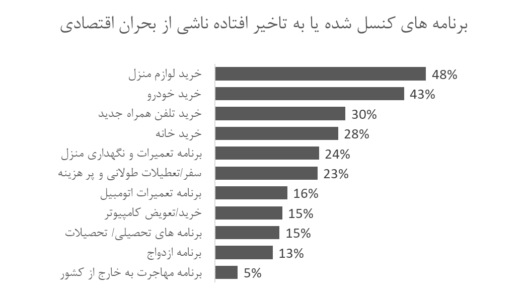 همچنین، به دنبال بحران اقتصادی پیش‌آمده، بسیاری از خانوارهای ایرانی برنامه‌های پیش‌بینی‌شدۀ خود را به تعویق انداخته یا کنسل کرده‌اند.