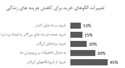 در چنین شرایطی، خانوارهای ایرانی سعی دارند الگوهای رفتاری خود را به‌سرعت تغییر دهند. طبق بررسی‌های صورت‌گرفته، ۸۰درصد از خانوارها در الگوهای خرید خود تغییراتی برای کم‌کردن هزینه‌ها داشته‌اند. خرید از فروشگاه‌های ارزان‌تر، توجه و جست‌وجو به دنبال تخفیفات و پروموشن‌ها و خرید از برندهای ارزان‌تر، بیشترین راهکارهای به‌کاربرده‌شده هستند.