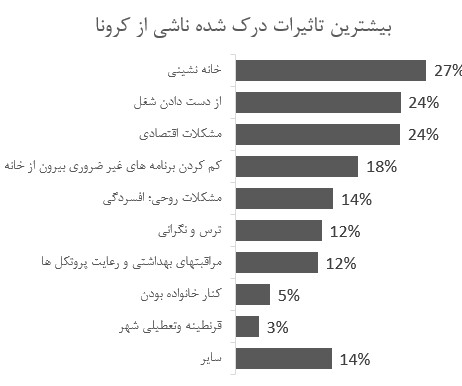 به دنبال بحران کرونا، از هر ۱۰ نفر ۹ نفر درگیر همه‌گیری شده‌اند. بیش از یک‌پنجم افراد خانه‌نشینی، بیکاری و مشکلات اقتصادی را داشته‌اند. علاوه بر این، زمان سپری‌شده در خانه، در دوران همه‌گیری، با افزایش ۴۵درصدی، از حدود ۱۵ ساعت، به ۲۱ ساعت در شبانه‌روز رسیده است. از هر ۱۰ نفر، ۲ نفر کم‌شدن برنامه‌های تفریحی و غیرضروری بیرون از خانه را تجربه کرده‌اند. مشکلات روحی، افسردگی، ترس و نگرانی از دیگر تأثیرات این همه‌گیری بوده است. طبق گزارش مرکز آمار در بهار ۱۳۹۹، تحت‌تأثیر کرونا حدود ۲میلیون نفر از بازار کار خارج شده‌اند. همچنین، بیش از ۶۵درصد از افراد نگران ابتلا به بیماری، عدم ایمنی و قرارگیری در معرض ویروس هستند. بیش از ۶۰درصد نگران ازدست‌دادن شغل و کاهش درآمد خود هستند. ابتلا به مشکلات روحی‌روانی از دیگر نگرانی‌ها در دوران همه‌گیری است. درمجموع بیش از ۸۰درصد افراد در دوران خانه‌نشینی ناشی از همه‌گیری، زمان بیشتری را با خانوادۀ خود سپری کرده‌اند. تماشای بیشتر از قبل تلویزیون و گذراندن وقت بیشتر برای ارتباطات در شبکه‌های اجتماعی، از دیگر فعالیت‌های این دوران بوده است. نیمی از افراد زمان بیشتری به مطالعه، یادگیری مهارت‌های جدید و ورزش‌کردن اختصاص داده‌اند.