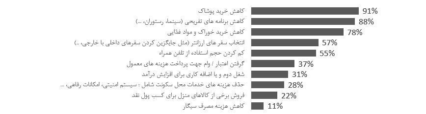 در اثر ناهمخوانی درآمد و هزینه درپی بحران اقتصادی، خانوارها با مشکلات اقتصادی متعددی ازجمله مدیریت هزینه‌ها، تأمین معیشت و خوراک، مسکن و ازدواج مواجه شدند. بیش از ۹۰درصد خانوارها به دنبال راهکاری برای کاهش تأثیر افزایش هزینه‌های ناشی از بحران در زندگی خود هستند. خرید کمتر اقلام ضروری مانند مواد غذایی و کمترضروری مانند پوشاک، همچنین تغییرات الگوی زندگی در برنامه‌های تفریحی، از راهکارهایی است که بیش از ۸۰درصد خانوارها در پاسخ به افزایش هزینه‌های زندگی در پیش گرفته‌اند.