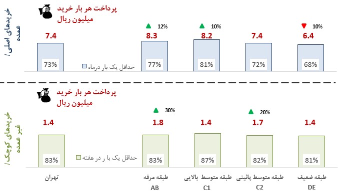 همچنین، خانوارهای طبقۀ کم‌درآمد، ۱۰درصد کمتر از متوسط خرید عمدۀ ماهانه هزینه می‌کنند؛ ارزش ریالی هر سبد خرید عمده در این خانوارها در مقایسه با طبقۀ مرفه ۲۵درصد کمتر است. خانوارهای طبقۀ مرفه در هر بار خرید غیرعمده به‌طور متوسط ۱۸۰هزار تومان پرداخت می‌کنند که ۳۰درصد بیشتر از متوسط است.