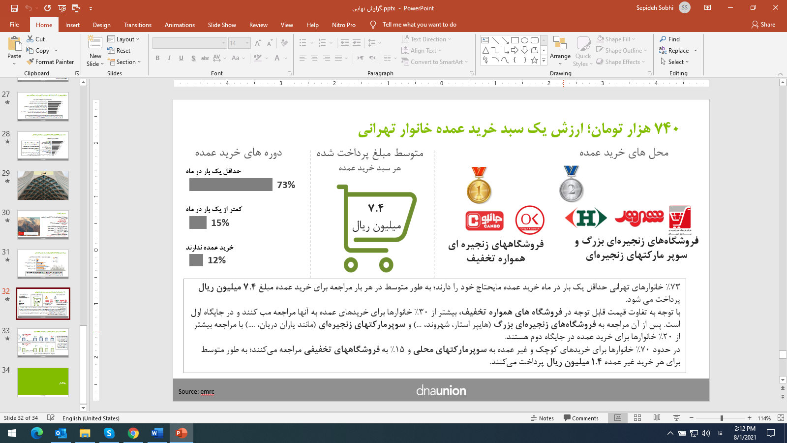 حدود ۷۳درصد خانوارهای تهرانی حداقل یک بار در ماه خرید عمدۀ مایحتاج خود را دارند که در هر بار مراجعه برای خرید عمده، به‌طور متوسط مبلغ ۷.۴میلیون ریال پرداخت می‌شود.