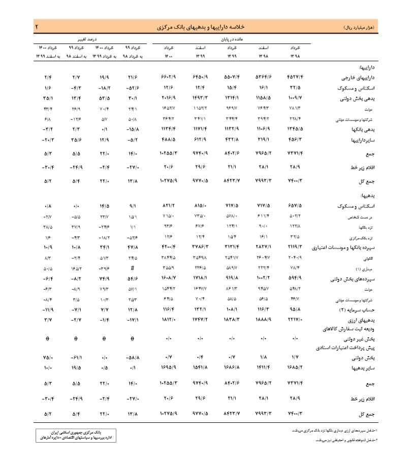 به طور مشخص در بخش دارایی های بانک مرکزی، با بخش های مهمی همچون «دارایی های خارجی»، «اسکناس و مسکوک»، «بدهی بخش دولتی» و «بدهی بانک ها» روبرو هستیم. بر این اساس در پایان بهار ۱۴۰۰، رقم دارایی های خارجی بانک مرکزی با رشد ۱۹.۹ درصدی نسبت به خردادماه ۹۹ به رقم ۶۶۰۲.۹ هزار میلیارد ریال رسیده است.