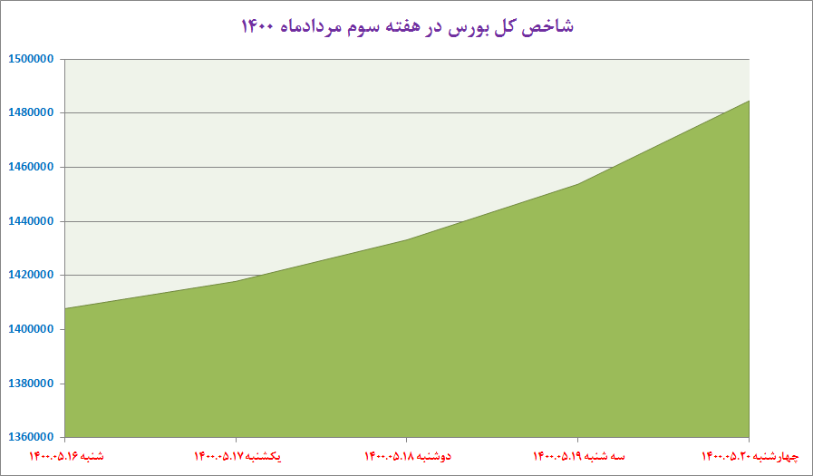 در نهایت، فعالان بازار سرمایه، در ایستگاه پایانی هفته (چهارشنبه ۲۰ مردادماه ۱۴۰۰) باز هم نظاره گر روند مثبت بورس بودند و بیشترین رشد نماگر بورس نیز در این روز رقم خورد. به گونه ای که شاخص کل بورس اوراق بهادار با افزایش ۳۰۷۷۸ واحدی معادل ۲.۱۲ درصد به یک میلیون و ۴۸۴ هزار و ۵۹۰ واحد رسید. در پایان آخرین روز فعالیت بازار نیز معامله‌گران بورس ۱۱ میلیارد و ۱۴۷ میلیون برگه بهادار و سهام را در قالب یک میلیون و ۱۰۴ هزار نوبت معامله و به ارزش ۹۸ هزار و ۸۱۰ میلیارد ریال داد و ستد کردند.