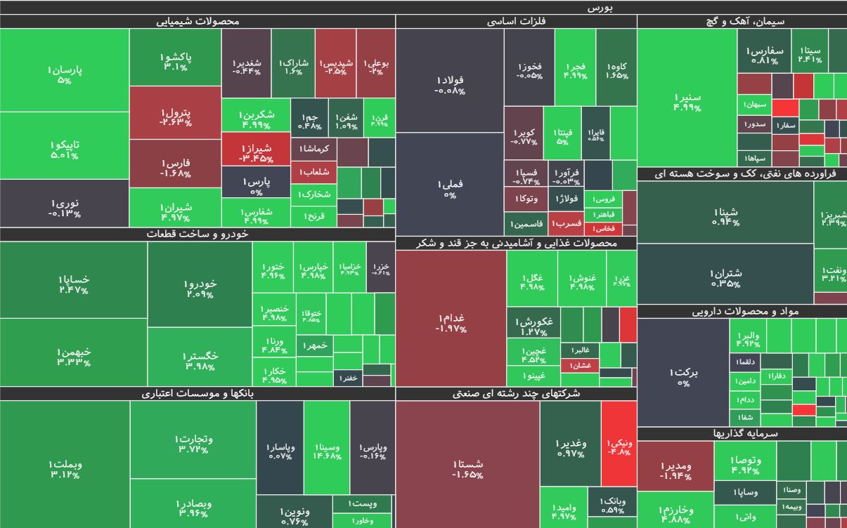 در بازار امروز، بیشترین افزایش قیمت متعلق به نماد اتکام(بیمه اتکایی امین) با ۴۸۲ درصد رشد و پس از آن، نمادهای وسینا، دامین، کرازی و قصفها بود. همچنین نماد معاملاتی قثابت(قند ثابت خراسان) با ۵.۶۶ درصد، بیشترین کاهش قیمت را داشت و پس از آن نیز، نمادهای نمرینو، قنیشا، ونیکی و دروز قرار گرفتند.