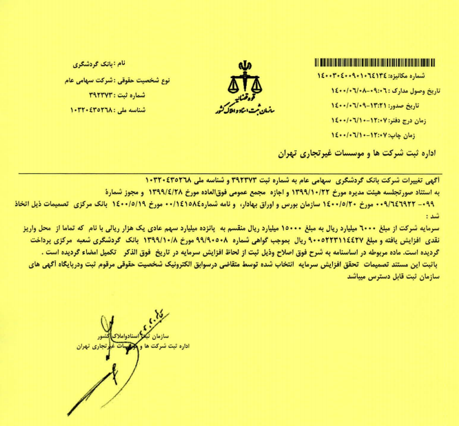 سامانه جامع اطلاع‌رسانی ناشران (کدال) با درج اطلاعیه‌ای خبر از افزایش سرمایه بانک گردشگری داد.