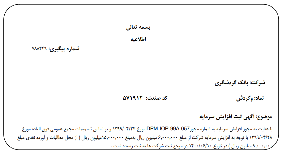 به گزارش ایبِنا؛ بر این اساس در آگهی ثبت افزایش سرمایه بانک گردشگری با نماد وگردش در کدال، آمده است: «با عنایت به مجوز افزایش سرمایه به شماره مجوز DPM-IOP-۹۹A-۰۵۷ مورخ ۱۳۹۹.۰۴.۲۴ و بر اساس تصمیمات مجمع عمومی فوق العاده مورخ ۱۳۹۹.۰۴.۲۸ با توجه به افزایش سرمایه شرکت از مبلغ ۶,۰۰۰,۰۰۰ میلیون ریال به مبلغ ۱۵,۰۰۰,۰۰۰ میلیون ریال (از محل مطالبات و آورده نقدی مبلغ ۹,۰۰۰,۰۰۰ میلیون ریال) در تاریخ ۱۴۰۰.۰۶.۱۰ در مرجع ثبت شرکت ها به ثبت رسیده است.»