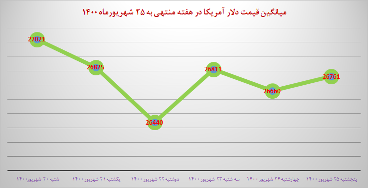 در نهایت در ایستگاه پایانی هفته، فراز و فرود دلار با افزایش همراه بود. به گونه ای که در ششمین و آخرین روز هفته (پنج شنبه ۲۵ شهریورماه ۱۴۰۰) در صرافی های بانکی و مجاز، میانگین قیمت فروش هر اسکناس دلار آمریکا به متقاضی دریافت ارز به رقم ۲۶۷۶۱ تومان رسید که نسبت به روز چهارشنبه، ۱۰۱ تومان افزایش نرخ داشت.