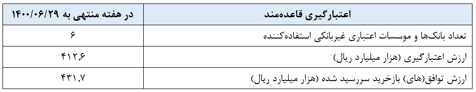 بانکها و موسسات اعتباری غیربانکی میتوانند در روزهای شنبه تا چهارشنبه از اعتبارگیری قاعدهمند (دریافت اعتبار با وثیقه از بانک مرکزی) مشروط به در اختیار داشتن اوراق مالی اسلامی دولتی و در قالب توافق بازخرید با نرخ سقف دالان نرخ سود (۲۲ درصد) استفاده کنند.