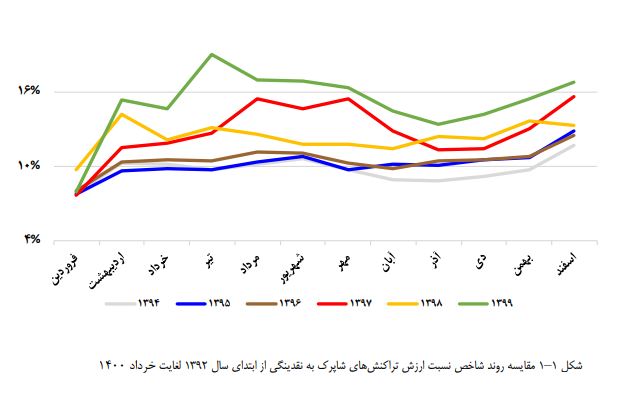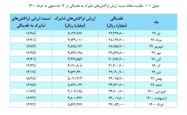 ارزش تراکنش‌های شاپرکی در خرداد ۱۴۰۰ به میزان ۱۴.۹۲ درصد از کل نقدینگی بوده که این شاخص نسبت به اردیبهشت ۱۴۰۰، افزایش ۱.۵۸ درصدی داشته است.