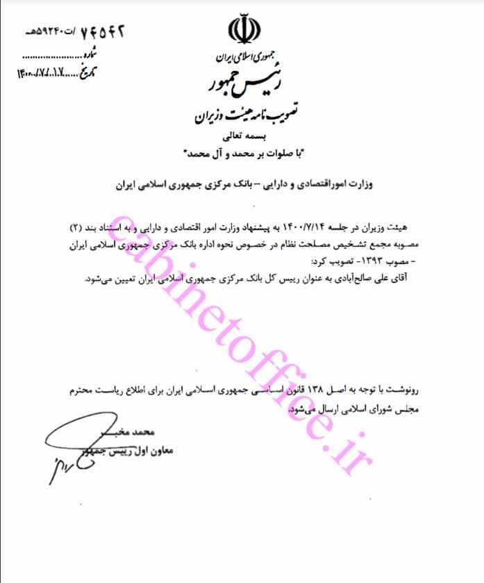 به گزارش ایبِنا به نقل از «پایگاه اطلاع رسانی دفتر هیات دولت» در جلسه هیات وزیران مورخ ۱۴ مهر ۱۴۰۰، آقای علی صالح آبادی به پیشنهاد وزیر امور اقتصادی و دارایی و تصویب هیئت وزیران، از سوی رئیس جمهور به عنوان رئیس کل بانک مرکزی جمهوری اسلامی ایران منصوب شد.