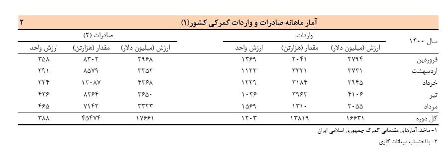 در ادامه این گزارش، آمار مربوط به تیرماه مشاهده می شود. بر این اساس ۳۹۶۳ هزار تن کالا در نخستین ماه تابستان به کشورمان وارد شده است که معادل ارزشی آن، ۴۱۰۶ میلیون دلار برآورد شده است. در این ماه ۸۳۶۴ هزار تن حجم صادرات از کشورمان بوده است که ارزش آن معادل ۳۶۵۰ میلیون دلار تعیین شده است.