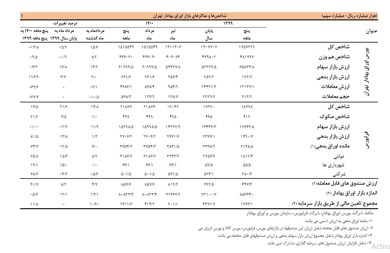 از سوی دیگر، اطلاعات منتشر در خصوص فرابورس نشان می دهد در دومین ماه تابستان امسال، شاخص کل فرابورس با رشد ۱۴.۸ درصدی نسبت به ماه قبل، به رقم ۲۱ هزار و ۸۷۷ واحد رسیده است. همچنین ارزش بازار سهام در مردادماه سال جاری با رشد ۱۱.۹ درصدی نسبت به ماه قبل، به رقم ۱۵۹۹۸.۵ هزار میلیارد ریال رسیده است که این رقم نسبت به پایان سال قبل، ۲.۷ درصد کمتر شده است. همچنین ارزش بازار بدهی در فرابورس در مردادماه امسال به رقم ۲۷۰۶.۲ هزار میلیارد ریال رسیده است که نسبت به ماه قبل، ۱.۳ درصد رشد داشته است.