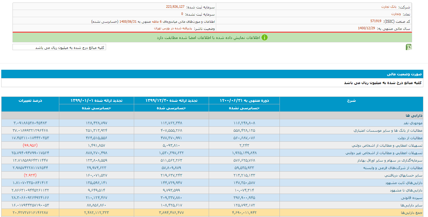 همچنین در بخش دارایی های بانک تجارت، مشاهده می شود که موجودی نقد این بانک در دوره منتهی به ۱۴۰۰.۰۶.۳۱ (حسابرسی نشده) ۱۱۶,۲۴۸,۸۰۸ میلیون ریال تعیین شده که نسبت به میزان تجدید ارائه شده در تاریخ ۱۳۹۹.۱۲.۳۰، بیش از ۳ درصد رشد داشته است. همچنین در این بخش، مطالبات بانک تجارت از بانک ها و سایر موسسات اعتباری در پایان تابستان سال جاری، به رقم ۵۵۸,۴۲۸,۱۲۵ میلیون ریال رسیده است.