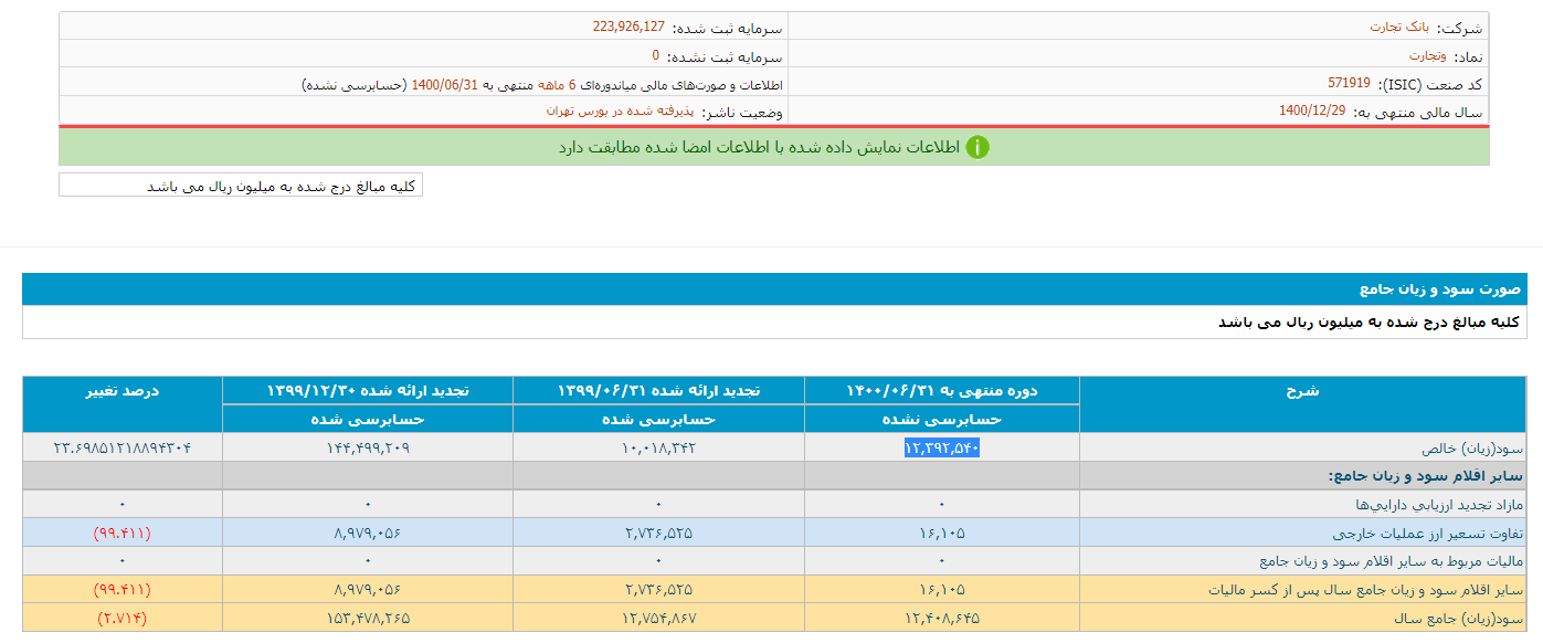 به گزارش ایبِنا، بررسی اطلاعات و صورتهای مالی تلفیقی دوازده ماهه منتهی به ۱۴۰۰.۰۶.۳۱ (حسابرسی نشده) بانک تجارت نشان میدهد در بخش صورت سود و زیان جامع این بانک، سود خالص در دوره منتهی به ۱۴۰۰.۰۶.۳۱ با رشد ۲۳.۶۹ درصدی نسبت به رقم حسابرسی شده در زمان تجدید ارائه شده پایان تابستان سال گذشته، به رقم ۱۲,۳۹۲,۵۴۰ میلیون ریال رسیده است.