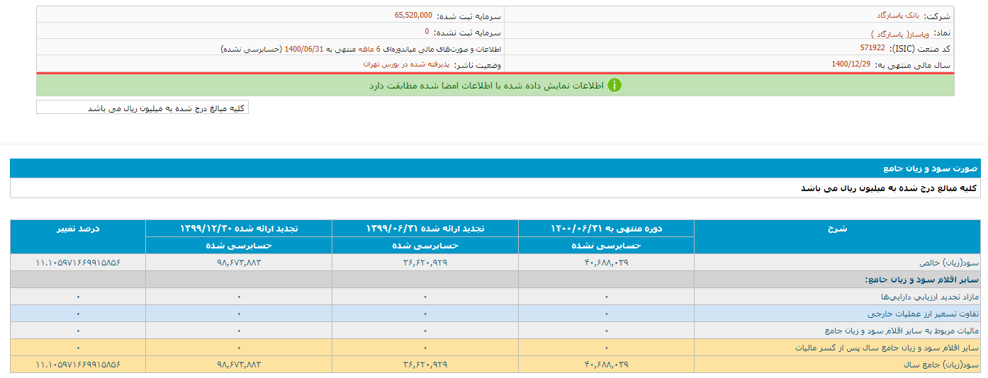به گزارش ایبِنا، بررسی اطلاعات و صورتهای مالی تلفیقی دوازده ماهه منتهی به ۱۴۰۰.۰۶.۳۱ (حسابرسی نشده) بانک پاسارگاد نشان میدهد در بخش صورت سود و زیان جامع این بانک، سود خالص در دوره منتهی به ۱۴۰۰.۰۶.۳۱ با رشد ۱۱.۱۰ درصدی نسبت به رقم حسابرسی شده در زمان تجدید ارائه شده پایان تابستان سال گذشته، به رقم ۴۰,۶۸۸,۰۳۹ میلیون ریال رسیده است.