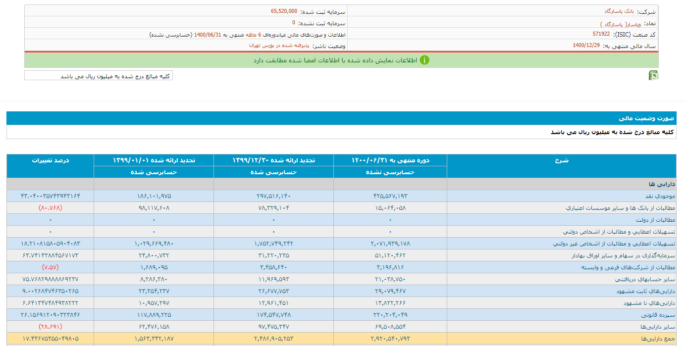 همچنین در بخش دارایی های بانک پاسارگاد ، مشاهده می شود که موجودی نقد این بانک در دوره منتهی به ۱۴۰۰.۰۶.۳۱ (حسابرسی نشده) ۴۲۵,۵۶۷,۱۹۳ میلیون ریال تعیین شده که نسبت به میزان تجدید ارائه شده در تاریخ ۱۳۹۹.۱۲.۳۰، بیش از ۴۳ درصد رشد داشته است. همچنین در این بخش، مطالبات بانک پاسارگاد از بانک ها و سایر موسسات اعتباری در پایان تابستان سال جاری، به رقم ۱۵,۰۶۴,۰۵۸ میلیون ریال رسیده است.