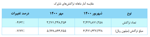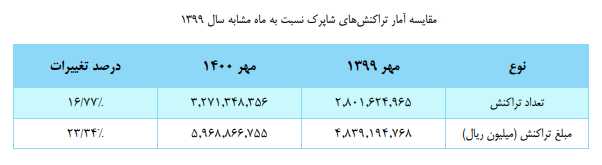 همچنین تراکنش های مهر ۱۴۰۰ به نسبت ماه مشابه سال ۱۳۹۹ از نظر تعدادی ۱۶.۷۷ درصد و از نظر ریالی ۲۳.۳۴ درصد رشد داشته است.