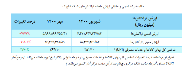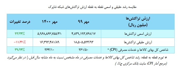 لازم به ذکر است که ارزش اسمی تراکنشهای مهر ۱۴۰۰ نسبت به ماه گذشته با رشد منفی ۷.۷۷ درصدی همراه بوده و این در حالی است که ارزش حقیقی تراکنشها در مهر ۱۴۰۰ رشد منفی ۱۱.۰۶ درصدی را تجربه نموده است. ارزش حقیقی تراکنشها در واقع ارزش تراکنشهای شاپرکی بدون در نظر گرفتن اثرات تورم است. به عبارت دیگر ارزش تراکنش های شاپرکی که نسبت به نرخ تورم خالص سازی شده است، ارزش حقیقی تراکنشهای شاپرکی را تشکیل میدهد.