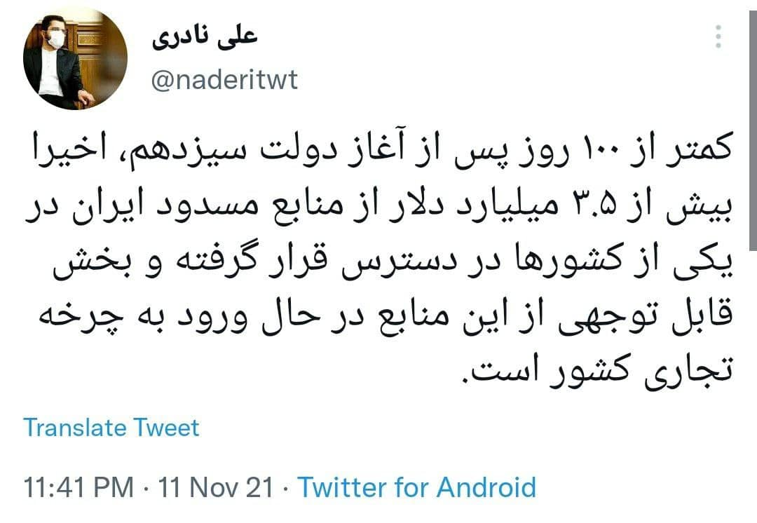 یکی از اعضای تیم رسانه‌ای دولت در توییتی اعلام کرد که کمتر از ۱۰۰ روز پس از آغاز دولت سیزدهم، اخیرا بیش از سه و نیم میلیارد دلار از منابع مسدود ایران در یکی از کشورها در دسترس قرار گرفته است.