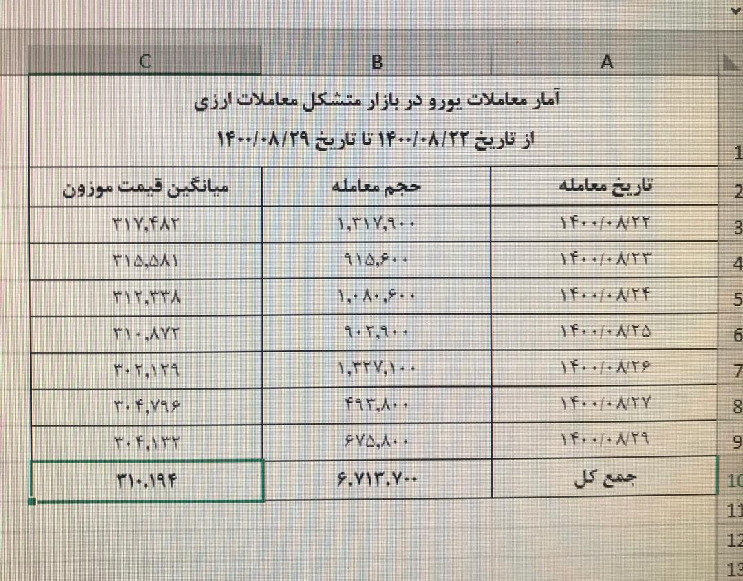 خاطرنشان می‌شود، میانگین قیمت موزون یورو در بازار متشکل معاملات ارزی در بازه زمانی ۱۵ الی ۲۲ آبان ماه ۱۴۰۰، ۳۱ هزار و ۱۰۹ تومان بوده است که این نرخ در بازه زمانی ۲۲ الی ۲۹ آبان ماه ۱۴۰۰ به ۳۱ هزار تومان کاهش یافته است.