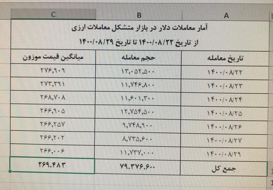 همچنین در بازه زمانی۲۲ الی ۲۹ آبان ماه ۱۴۰۰، حجم کل آمار معاملات دلار در بازار متشکل معاملات ارزی، ۷۹ میلیون و ۳۷۶ هزار دلار و حجم کل آمار معاملات یورو در همین بازار، شش میلیون و ۷۱۳ هزار یورو بوده است.