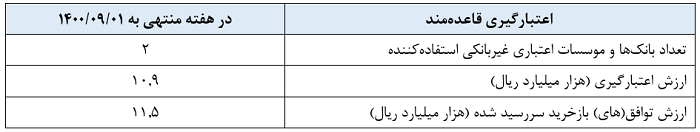 بانکها و موسسات اعتباری غیربانکی میتوانند در روزهای شنبه تا چهارشنبه از اعتبارگیری قاعدهمند (دریافت اعتبار با وثیقه از بانک مرکزی) مشروط به در اختیار داشتن اوراق مالی اسلامی دولتی و در قالب توافق بازخرید با نرخ سقف دالان نرخ سود (۲۲ درصد) استفاده کنند.