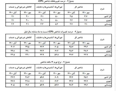 نرخ تورم ماهانه آبان ۱۴۰۰ به ۲.۵ درصد رسیده که در مقایسه با همین اطلاع در ماه قبل، ۲.۰ واحد درصد کاهش داشته است. نرخ تورم ماهانه برای خانوارهای شهری ۲.۴ درصد می‌باشد که نسبت به ماه قبل ۱.۲ واحد درصد کاهش داشته است. همچنین این نرخ برای خانوارهای روستایی ۲.۷ درصد بوده که نسبت به ماه قبل ۱.۴ واحد درصد کاهش داشته است.