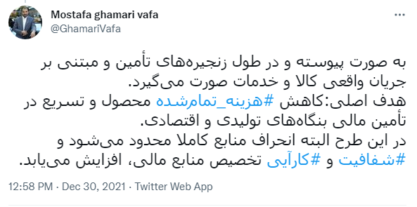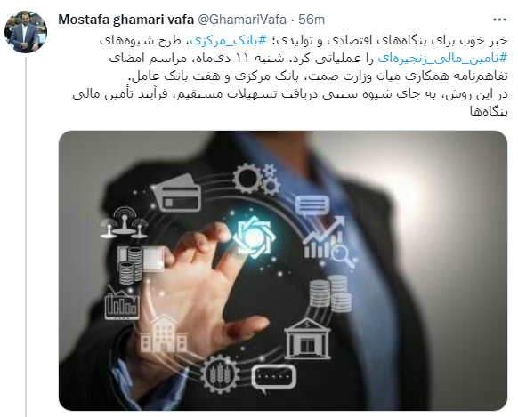 به گزارش خبرنگار ایبِنا؛ مصطفی قمری وفا، مدیر روابط عمومی بانک مرکزی در توییتی خبر داد روز شنبه ۱۱ دیماه، مراسم امضای تفاهمنامه همکاری میان وزارت صمت، بانک مرکزی و هفت بانک عامل برگزار می شود. در این روش، به جای شیوه سنتی دریافت تسهیلات مستقیم، فرآیند تأمین مالی بنگاهها به صورت پیوسته و در طول زنجیرههای تأمین و مبتنی بر جریان واقعی کالا و خدمات صورت میگیرد.