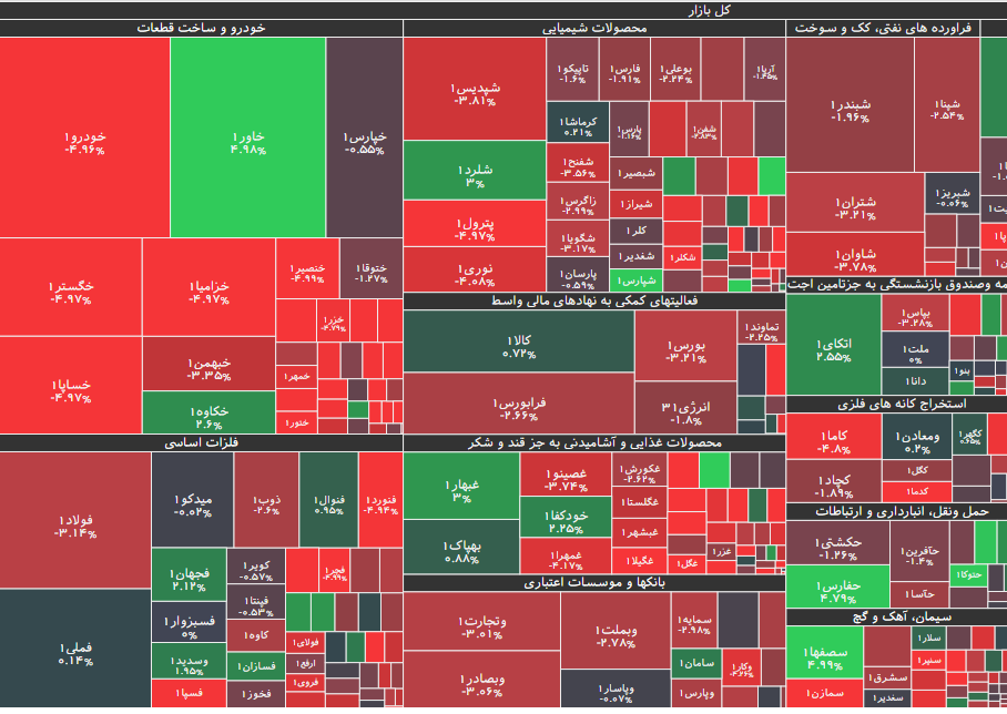 در بازار امروز، بیشترین افزایش قیمت متعلق به نماد دکیمی(کیمیدارو ) با ۴.۹۷ درصد رشد و پس از آن، نمادهای دروز، شپارس، قپیرا و حفارس بود. همچنین نماد معاملاتی ختور(رادیاتور ایران) با ۴.۹۸ درصد، بیشترین کاهش قیمت را داشت و پس از آن نیز، نمادهای خکمک، پکرمان، غنوش و غبهنوش قرار گرفتند.