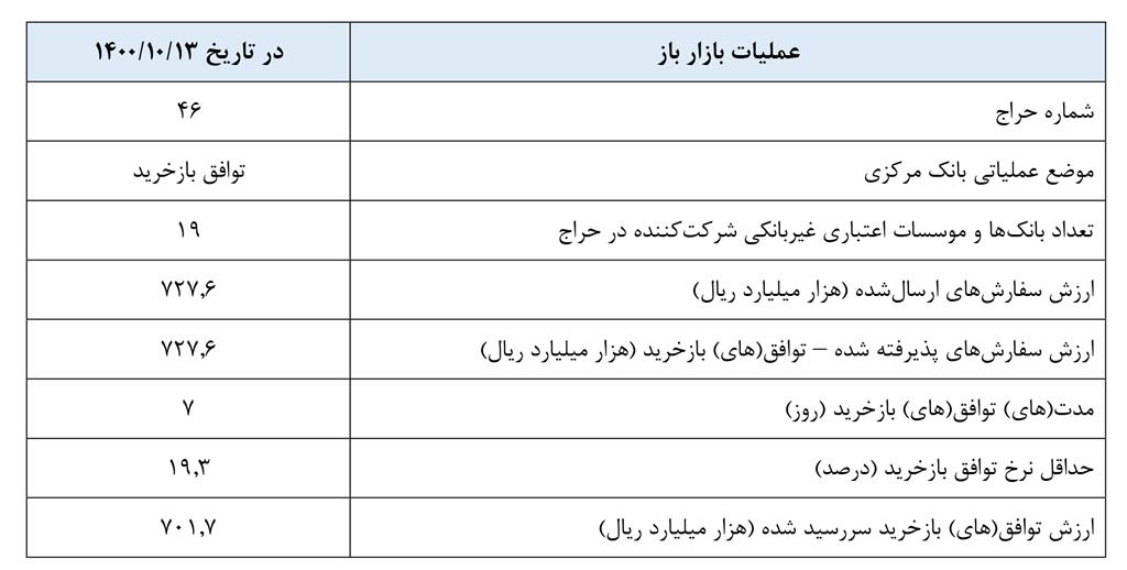 به گزارش ایبِنا به نقل از روابط عمومی بانک مرکزی، با توجه به پیشبینی بانک مرکزی از وضعیت نقدینگی در بازار بینبانکی، موضع عملیاتی بانک مرکزی در این هفته توافق بازخرید بود. از این رو، این بانک به اجرای عملیات بازار باز در قالب توافق بازخرید به مبلغ 727.6 هزار میلیارد ریال اقدام کرد. مشروح این گزارش به شرح زیر است: