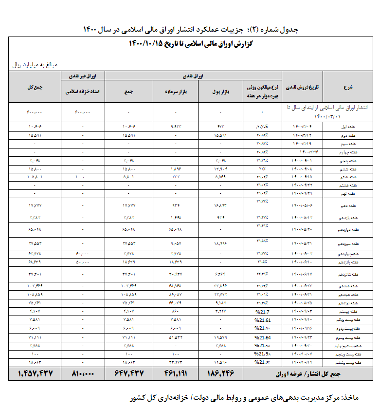بر اساس این گزارش حسب تصمیمات اتخاذ شده در راستای تأمین مالی بهینه، بیست و ششمین هفته عرضه اوراق بدهی برگزار شد که پس از اخذ سفارشهای خرید اوراق از متقاضیان یادشده در سامانههای بازار بینبانکی کارگزاری بانک مرکزی و مظنهیابی شرکت مدیریت فناوری بورس تهران، مجموعاً مبلغ ۴.۸۰۶ میلیارد تومان اوراق به صورت نقدی به فروش رسید.