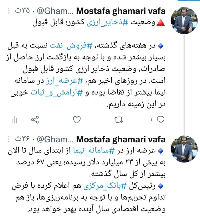 وی ادامه داد: عرضه ارز در سامانه نیما هم از ابتدای سال تا الان به بیش از ۲۳ میلیارد دلار رسیده؛ یعنی ۶۷ درصد بیشتر از کل سال گذشته است. قمری وفا در ادامه گفته است: رئیسکل بانک مرکزی هم اعلام کرده حتی با فرض تداوم تحریمها و با توجه به برنامهریزیها باز هم وضعیت اقتصادی سال آینده بهتر خواهد بود.