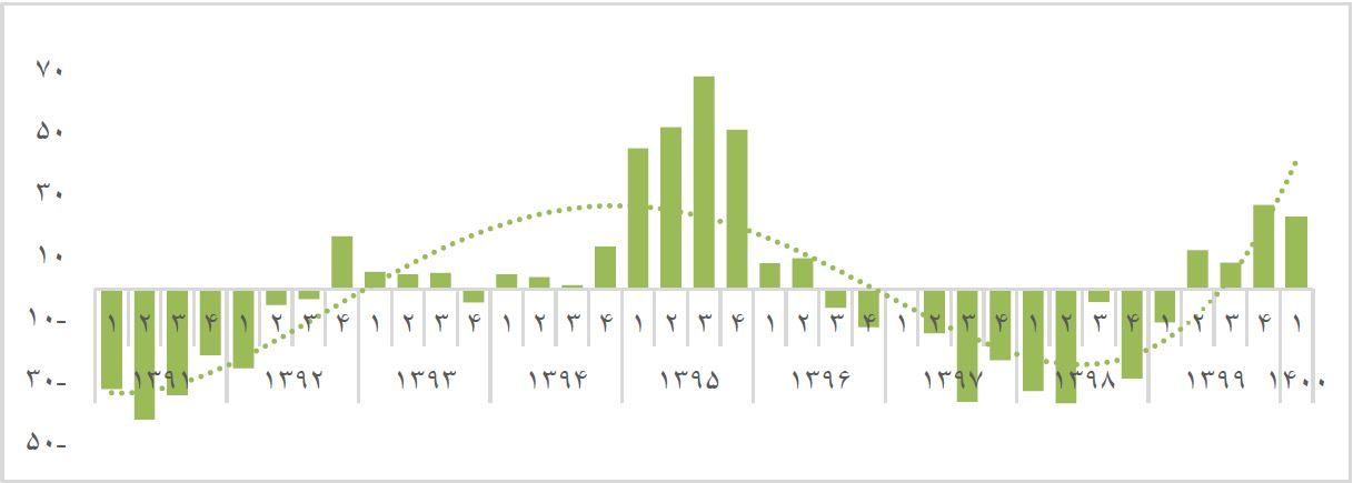نمودار ۲ رشد ارزش افزوده بخش نفت تا بهار ۱۴۰۰ را به صورت فصلی نشان میدهد. همانطور که ملاحظه میشود افت تولید بخش نفت در سالهای ۱۳۹۷ و ۱۳۹۸ قابل توجه بوده است، با توجه به تحریمهای آمریکا و تبعیت بخشی از خریداران نفت ایران از آن، رشد منفی بخش نفت مورد انتظار بوده است.
