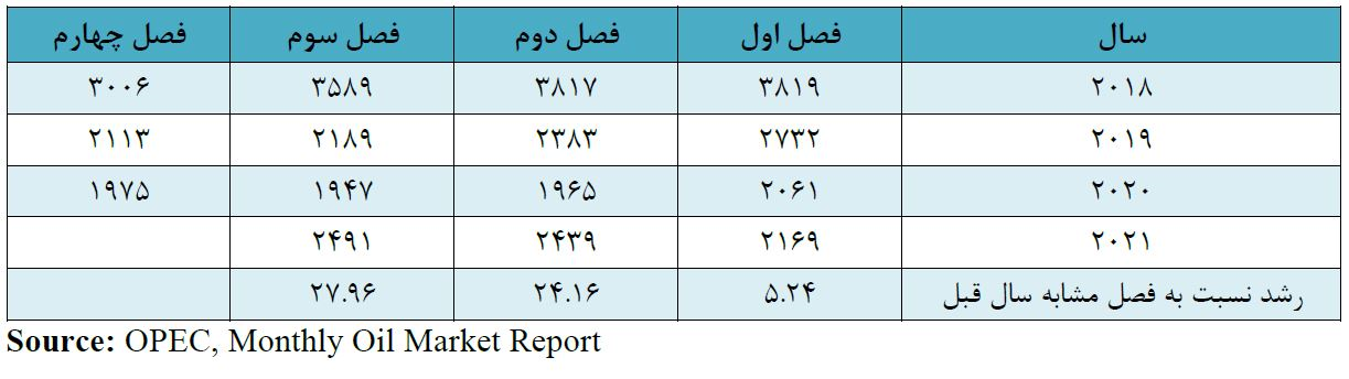 آمارهای سازمان اوپک از منابع ثانویه از سال ۲۰۱۸ در جدول ۱ ارائه شده است. همانطور که جدول ۱ نشان میدهد، تولید نفت ایران در فصول ۲ و ۳ سال ۲۰۲۱ (بهار و تابستان ۱۴۰۰ ) به ترتیب حدود ۲.۴۴ و ۲.۴۹ میلیون بشکه در روز بوده است که با در نظر گرفتن مصرف حدود ۱.۷ میلیون بشکهای روزانه نفت خام در داخل به معنای صادرات ۷۷۰ و ۸۲۰ هزار بشکهای روزانه نفت خام در این فصول است.