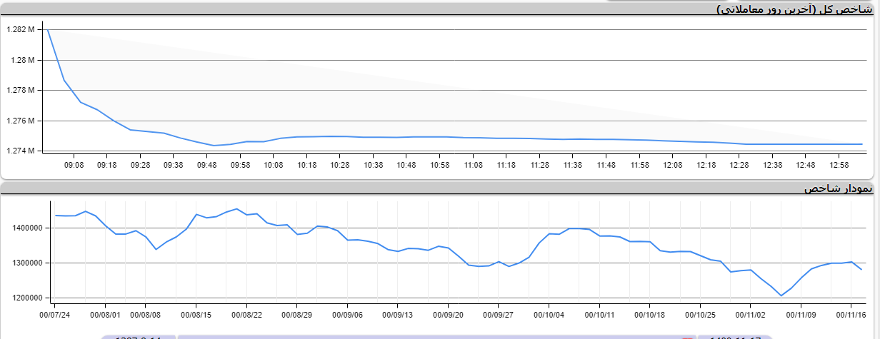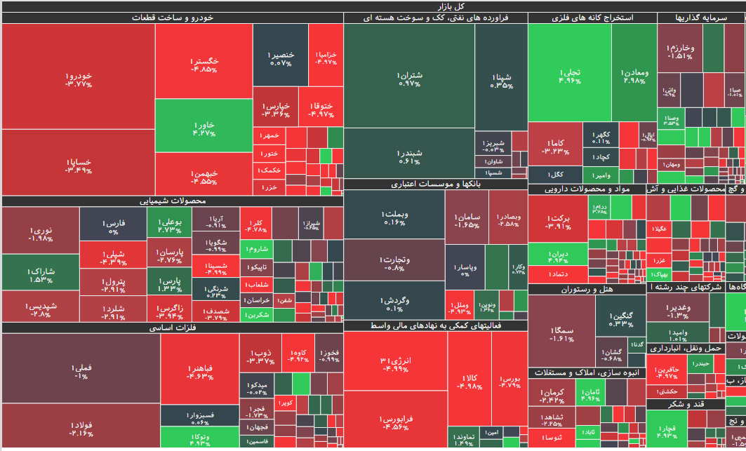 شاخص کل بورس اوراق بهادار با کاهش ۷۵۶۱ واحدی معادل ۰.۵۹ درصد، به یک میلیون و ۲۷۴ هزار و ۴۸۸ واحد رسید. همچنین در فرابورس شاخص کل با افت ۴ واحدی به ۱۷ هزار و ۳۷۳ واحد رسید.