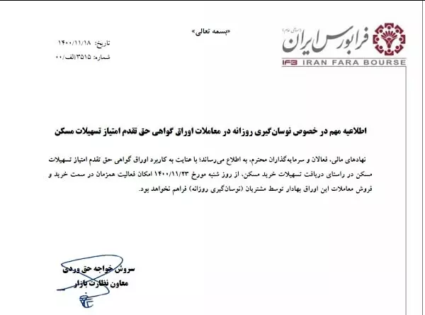 به گزارش ایبِنا، سروش خواجه حق‌وردی معاون نظارت بازار فرابورس ایران در اطلاعیه‌ای اعلام کرد: با عنایت به کاربرد اوراق گواهی حق تقدم امتیاز تسهیلات مسکن در راستای دریافت تسهیلات خرید مسکن، از روز شنبه ۲۳ بهمن سال جاری امکان فعالیت همزمان در سمت خرید و فروش معاملات این اوراق بهادار توسط مشتریان (نوسان گیری روزانه) فراهم نخواهد بود.